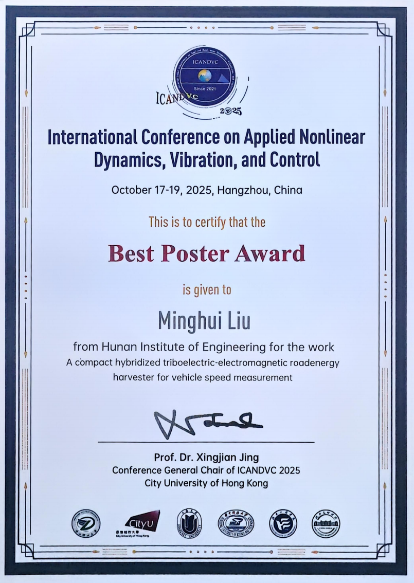 近日,2025年国际应用非线性动力学、振动与控制会议(ICANDVC-2025)在杭州隆重举行。永利官网刘胜副教授指导的硕士研究生刘明惠同学凭借其出色的研究成果,荣获会议“最佳海报奖”。